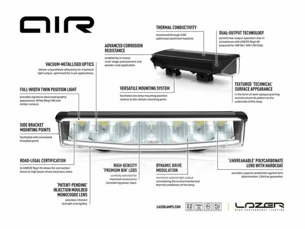 En plus des niveaux enviables d’illumination de faisceau de route fournis, tous les produits AIR disposent d’une lumière de position intégrée « double » blanche ou ambre. Outre les avantages en termes de sécurité, l’utilisation des dernières technologies et matériaux a créé une apparence distinctive visible de près ou de loin. Lorsque la lumière de position blanche fonctionne, elle est approuvée selon la norme UNECE Reg148 pour une utilisation sur route.