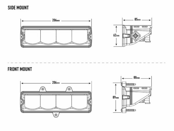 Pour faciliter le montage des feux sur divers véhicules, les lampes Carbon-4 sont livrées avec l’option de montage avant ou latéral. Veuillez consulter les images du produit pour plus de détails, ou des données de modèle CAD de base sont disponibles sur demande si une analyse plus approfondie de chaque option de montage est nécessaire avant l’achat.