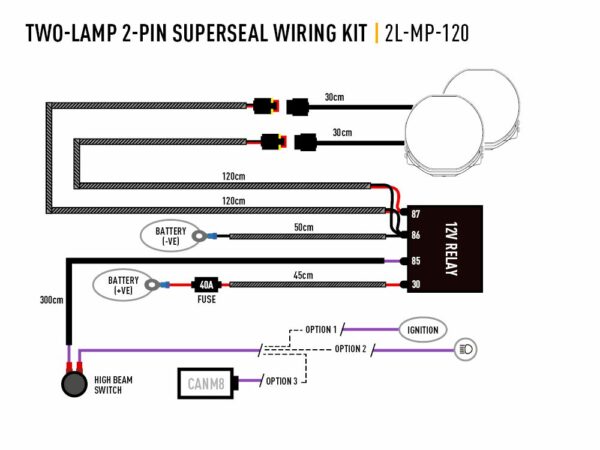 Kit de câblage deuxe lampes pour feux à LED hautes performances Lazer Lamps. Le montage est rapide, facile et fiable avec la connexion Superseal 2 broches et aucune procédure de configuration. Le kit comprend un relais 12 V (dans un boîtier étanche), un fusible, une borne de batterie à une extrémité, et 1,2 m de flexible sur le câble de lampe. De plus, il permet d’utiliser des produits Lazer soit en parallèle avec l’éclairage standard du véhicule, et/ou via un contacteur indépendant qui peut être monté à l’intérieur de votre véhicule.