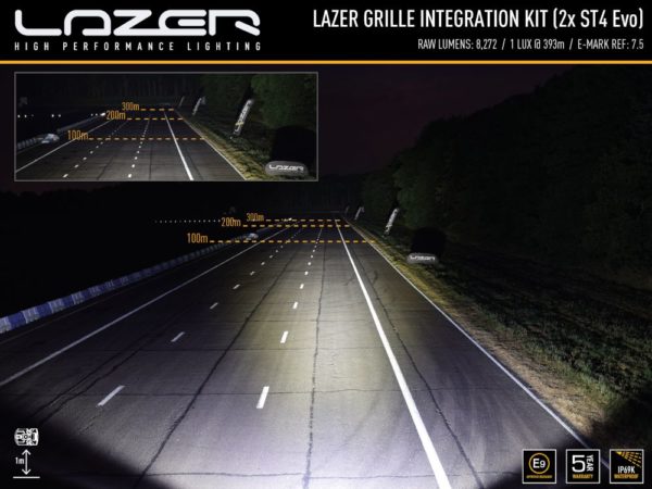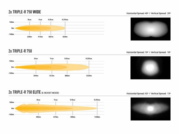 L’option ST4 Evolution offre un bon éclairage à distance (1 lux à 393 m) mais avec une répartition de la lumière sur tout le pourtour qui assure une excellente visibilité à gauche / droite et haut / bas. À cet égard, le ST4 est particulièrement bien adapté aux clients conduisant dans des zones rurales ou hors route. En revanche, la Triple-R 750 (disponible en qualité Standard ou Elite) délivre un faisceau ponctuel de 1 lux atteignant 612 m ou 679 m selon la version de lampe choisie. Les deux options sont entièrement approuvées ECE pour une utilisation sur route.