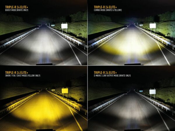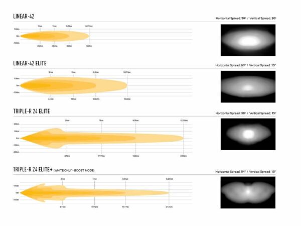 Né du développement et des tests aux plus hauts niveaux du sport automobile professionnel, le Triple-R 24 représente le summum de l’éclairage LED longue portée. Bénéficiant de 24 600 lumens bruts, le motif de faisceau ponctuel délivre de 1 lux à 1,1 km. En revanche, le Linear-42, avec sa conception aérodynamique à profil bas, est le choix parfait pour les clients à la recherche de quelque chose de plus discret, avec l’avantage supplémentaire d’un faible bruit de vent supérieur à des vitesses de conduite élevées. Malgré les proportions plus petites de la lumière, les performances d’éclairage sont toujours exceptionnelles avec le modèle de faisceau correspondant à un excellent éclairage à distance (1 lux à près de 500 m), avec une diffusion de la lumière à gauche / droite de la route qui ne laisse rien à l’imagination. Le Linear-42 est également conforme aux réglementations CEE-ONU autorisant la connexion de la lampe à vos feux de route standard (lorsque les réglementations locales le permettent).