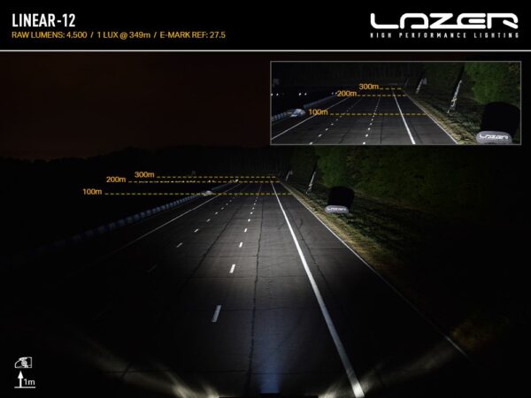 Utilisant 12x LED 3W très efficaces, le Linear-12 délivre 4500 lumens et 1 Lux à près de 350m, ceci avec une consommation électrique minimale de 42W et une consommation de courant de 2,9Amps. La distribution de la lumière peut être mieux décrite comme « large », ce qui n’enlève rien à l’éclairage de distance enviable, fournit une propagation gauche / droite confortable de la lumière, avec une propagation haut / bas comparativement plus faible (par rapport à l’équivalent ST ou Triple -R product), ce qui rend le Linear-12 particulièrement bien adapté aux positions d’installation plus basses, telles que la grille de véhicule ou le montage de la plaque d’immatriculation.
