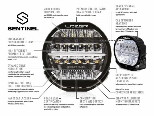 Nouveauté pour 2021, la gamme Sentinel comprend des lampes rondes de 9 pouces qui combinent un design de produit haut de gamme distinctif, des performances d’éclairage supérieures et une qualité de construction symbolique du nom Lazer Lamps. Le produit Sentinel Elite est disponible avec une finition intérieure noire élégante (également disponible avec une fonction de lumière de position blanche/ambre intégrée) et une combinaison de 32 LED haute puissance, représentant les meilleures performances d’éclairage attendues d’un produit portant la marque « Elite ». Mis à part les performances d’éclairage, le style méticuleux du produit garantit qu’il s’agit d’un produit qui se démarque pour toutes les bonnes raisons.