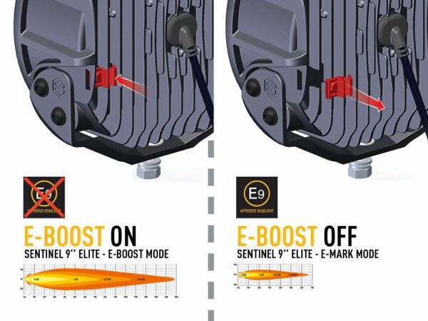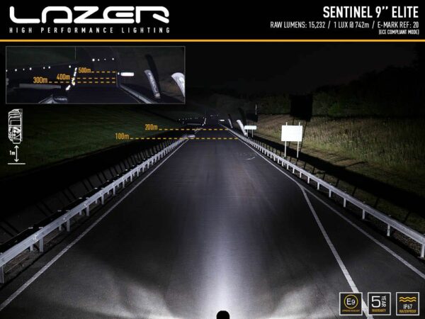 Émettant 15 232 lumens bruts, les lampes délivrent 1 lux à 742 m, mais c’est dans la diffusion horizontale de la lumière à 52 degrés et la visibilité sur les côtés de la route ou de la piste à moyenne et longue portée que la Sentinel Elite justifie vraiment sa raison d’être. Pour une démonstration des performances d’éclairage, veuillez cliquer sur la section vidéo. Comme tous les produits Lazer, la température de couleur à un agréable 5000K est agréable pour les yeux, tout en maximisant la netteté et la définition des objets en approche. La lampe est approuvée par la CEE-ONU conformément au règlement 112 en tant que feu de route, grâce à l’adoption de la technologie E-Boost à double sortie de Lazer ; fonctionnant à 100%, la puissance lumineuse est au-delà de la limite autorisée par la réglementation ECE, donc retirer le capuchon Boost fourni à l’arrière de la lampe réduit la puissance lumineuse pour qu’elle soit dans la limite autorisée.