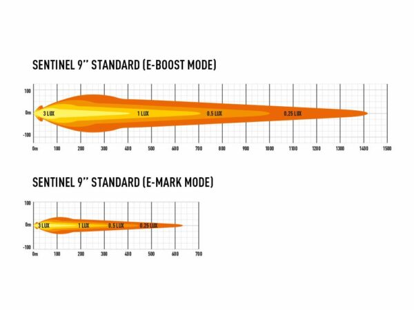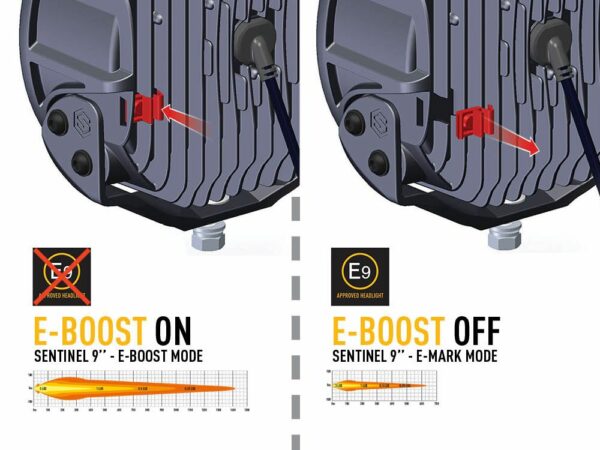 La gamme Sentinel 9 » « Standard », produit 9 529 lumens bruts, les lampes délivrent 1 lux atteignant plus de 700 m ; impressionnant en soi, mais compte tenu de l’angle de faisceau horizontal de 52 degrés, il s’agit d’un produit qui a été conçu pour offrir une visibilité maximale pour toutes sortes d’utilisations sur route et hors route. Comme tous les produits Lazer, la température de couleur à un agréable 5000K est agréable pour les yeux, tout en maximisant la netteté et la définition des objets à venir. La lampe est approuvée par la CEE-ONU conformément au règlement 112 en tant que feu de route, grâce à l’adoption de la technologie E-Boost à double sortie de Lazer ; fonctionnant à 100%, la puissance lumineuse est au-delà de la limite autorisée par la réglementation ECE, donc retirer le capuchon Boost fourni à l’arrière de la lampe réduit la puissance lumineuse pour qu’elle soit dans la limite autorisée.
