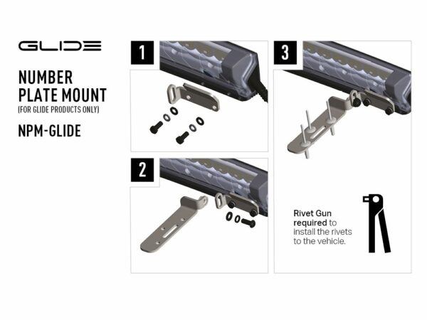*Pour un montage sous la plaque d’immatriculation, veuillez utiliser notre Support de Plaque d’Immatriculation générique, avec les supports latéraux Glide.
